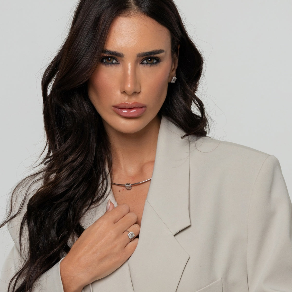 Linhas retas, brilho intenso e personalidade marcante. O anel Frame traz moissanites lapidadas com precisão para um efeito de luz incomparável. Uma joia que transmite força e elegância, perfeita para mulheres que sabem exatamente quem são