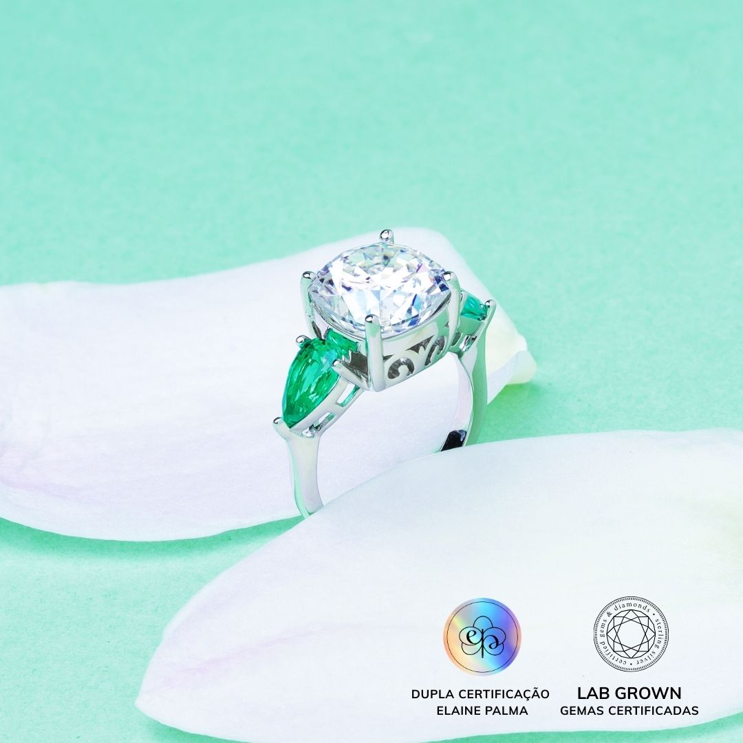 Anel com Esmeralda Lab Grown com lapidação gota e Moissanite com lapidação radiante, em prata 925 e banho de ródio.