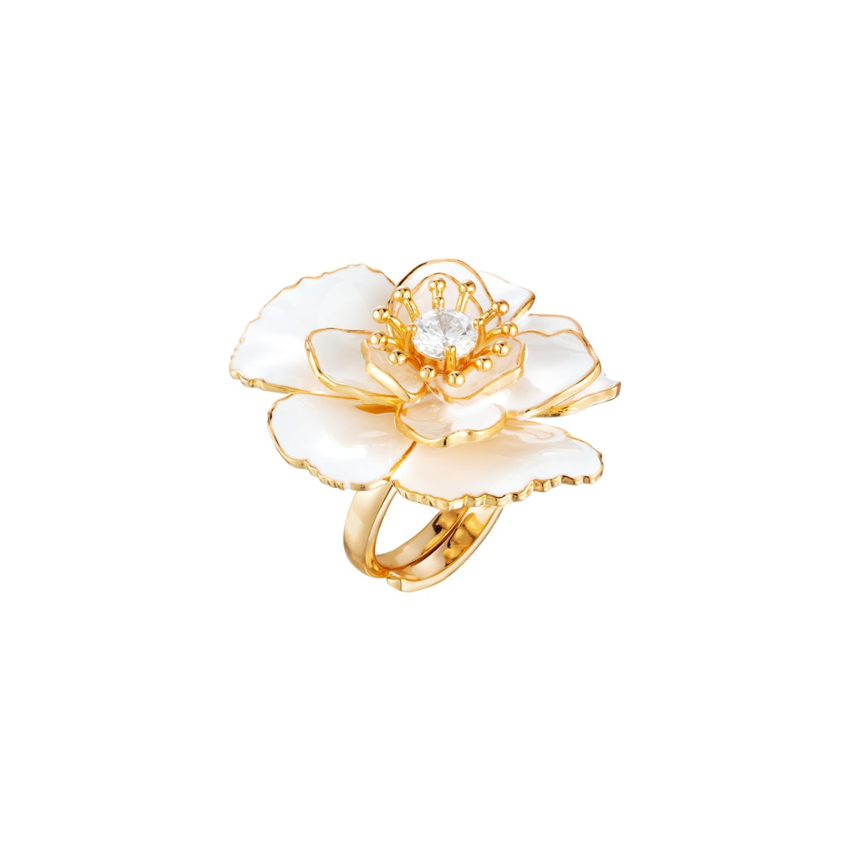 Anel em metal com designer de flor camelia, com esmaltação tipo lacquer na cor branca, e banho de ouro 18k.