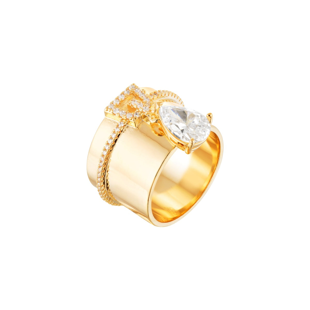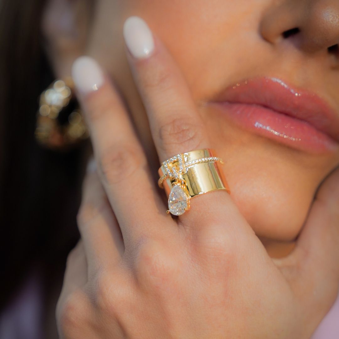 Anel em metal com banho de ouro 18k, zircônia gota na cor cristal, e microcravação na cor cristal.
