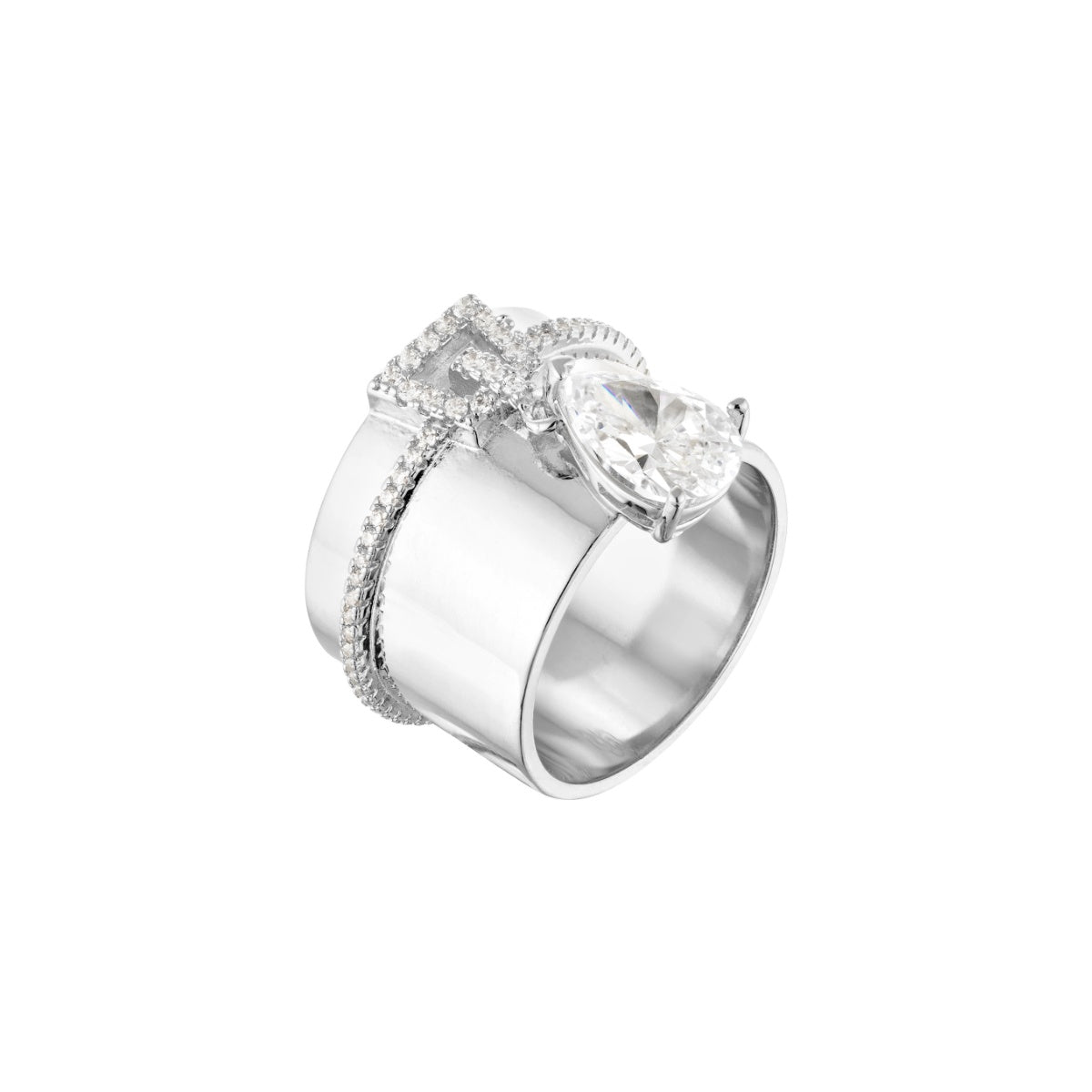 Anel em metal com banho de ródio, zircônia gota na cor cristal, e microcravação na cor cristal.