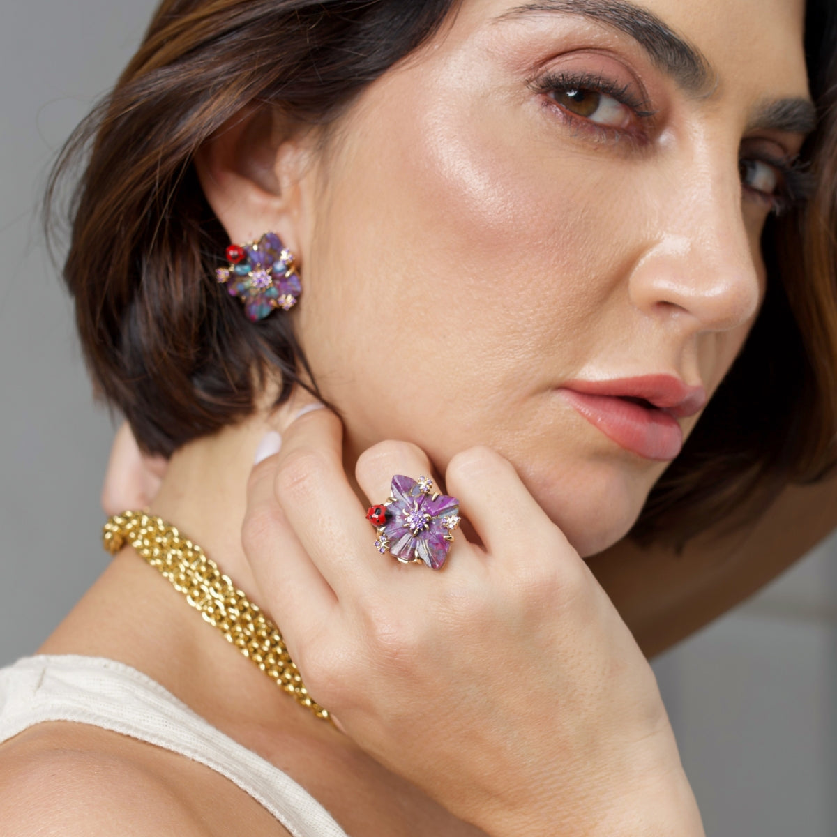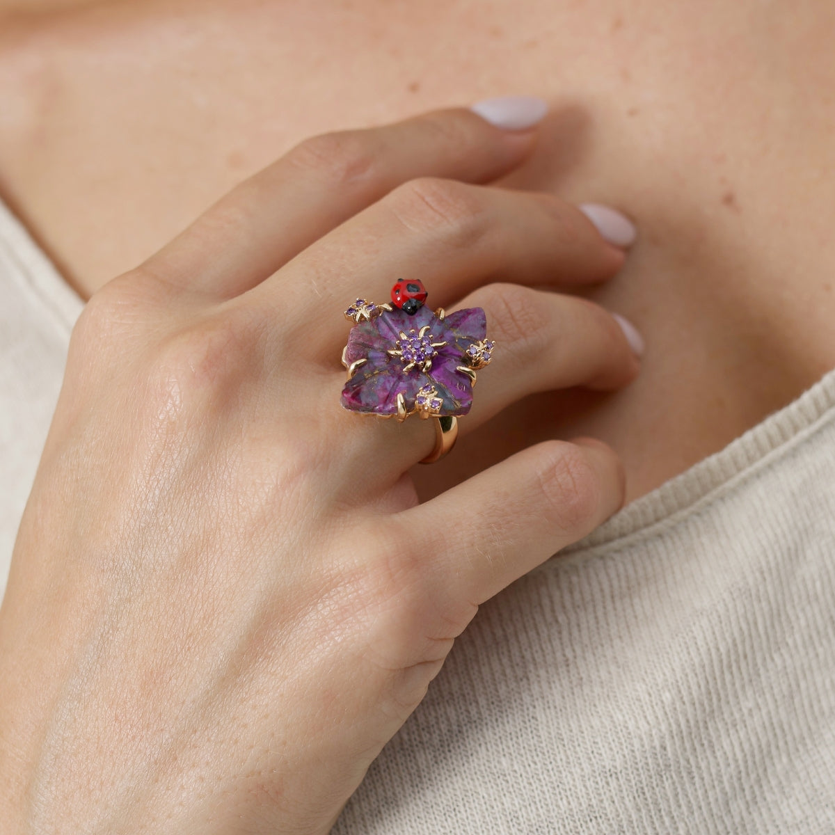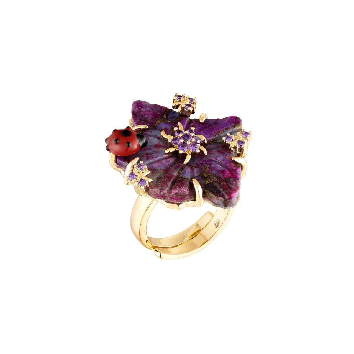 Anel em turquesa roxo esculpida com designer de flor, e joaninha com esmaltação tipo lacquer nas cores vermelho e preto, microcravação de zircônia na cor ametista, com banho de ouro 18k.