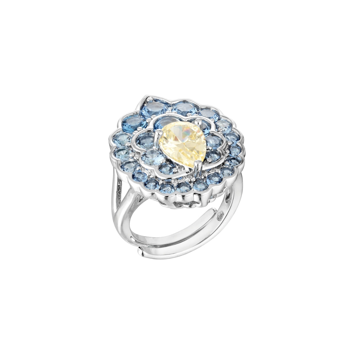 Anel com zircônia na cor topázio e citrino, banho de ródio.