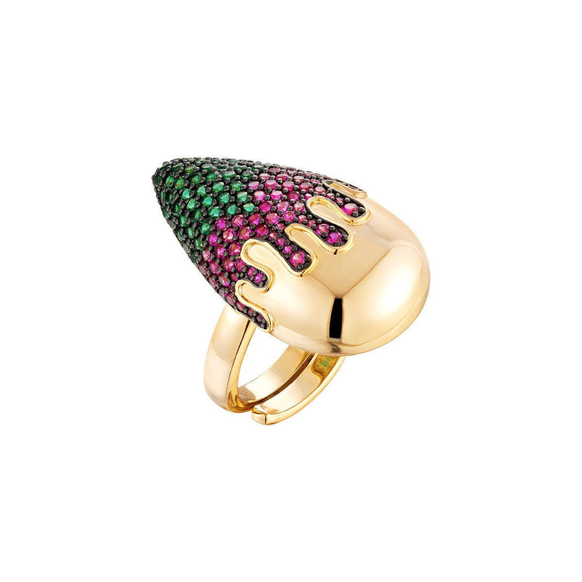 Anel em metal com banho de ouro 18k, zircônias nas cores pink diamond e esmeralda