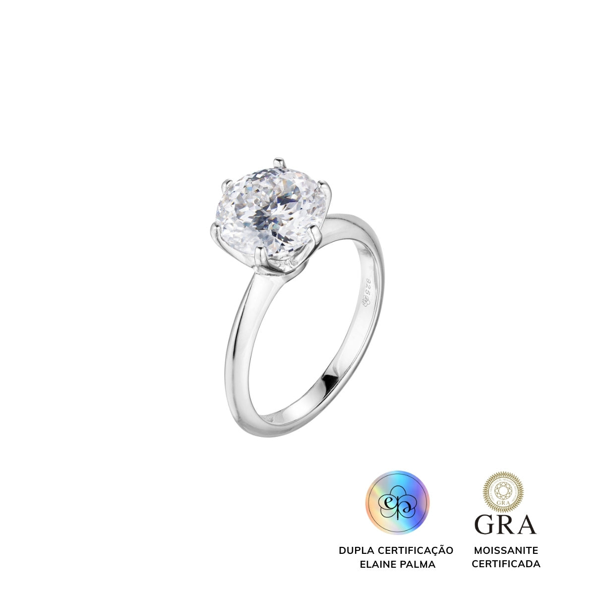 Anel solitário Moissanite de 6 garras, corte português 3.5 ct, de 9,5mm, em Prata 925 e banho de ródio.