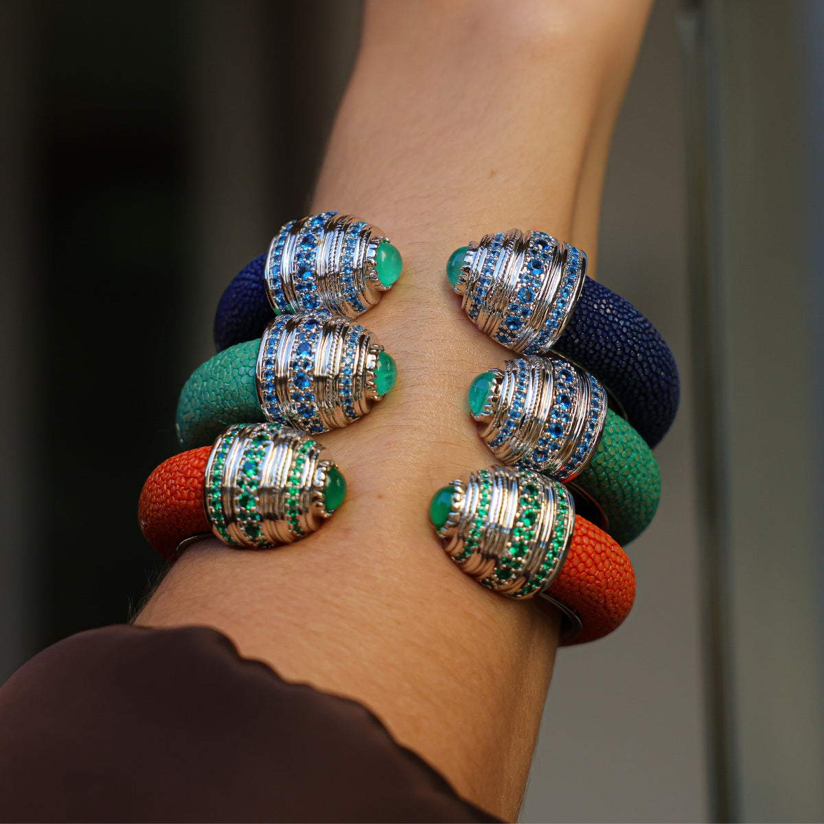 Bracelete galuchat com zircônia na cor esmeralda e turmalina, banho de ródio.