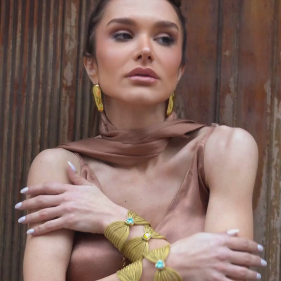 Fios entrelaçados em textura orgânica se unem em um pingente que forma um laço, símbolo de união e coragem. Uma peça que veste como um abraço de delicadeza e determinação.