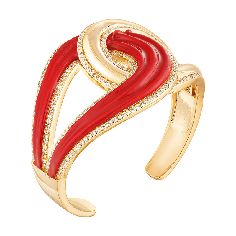 Bracelete em metal com esmaltação tipo lacquer, na cor vermelha, com banho ouro 18k.