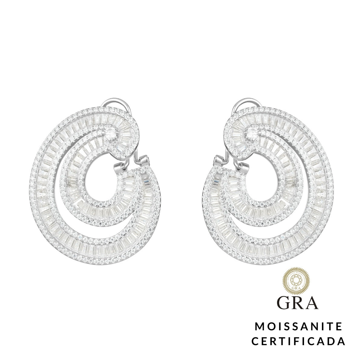 Brinco Moissanite 5,3ct e lapdação baguete, em Prata 925 com banho de ródio. Esta Joia acompanha o certificado internacional "GRA Jewellery" da Moissanite, garantindo a qualidade e autenticidade da(s) pedra(s).