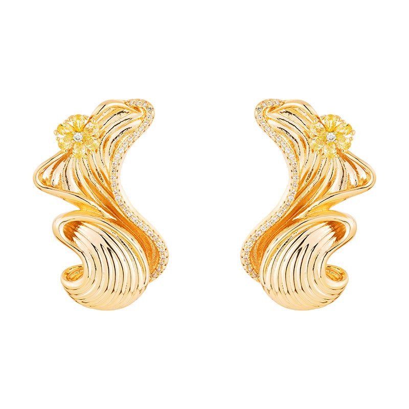 Brinco em metal com banho ouro 18k, com microcravação em zircônia na cor cristal, e flor com zircônias nas cores citrino e cristal.