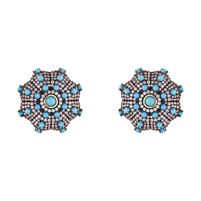 Brinco mandala, com turquesa e zircônia na cor ametista, em banho de ouro 18k.