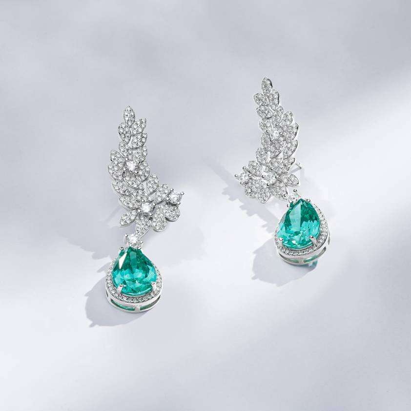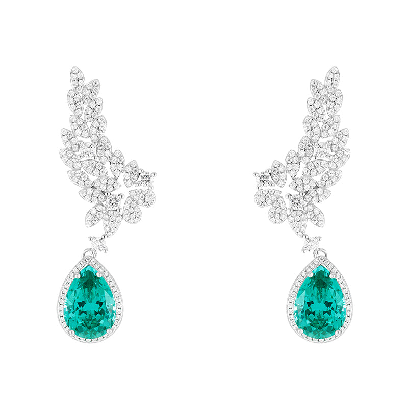 Brinco com Turmalina Paraíba Lab Grown, lapidação de gota e cravação em Moissanite, prata 925 com banho de ródio.