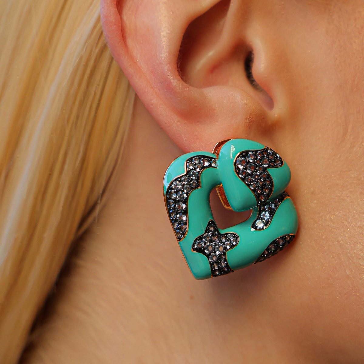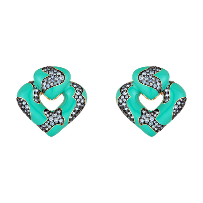 Brinco em lacquer na cor turquesa, com zircônia na cor ametista, banho de ouro 18k.