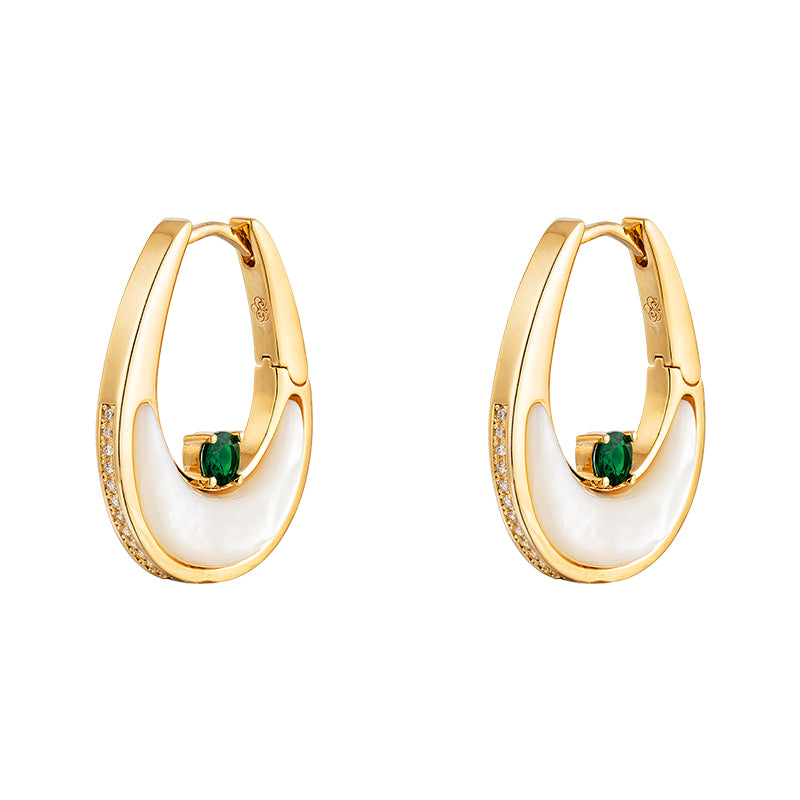 Brinco em metal com madrepérola, zircônias nas cores cristal e esmeralda, com banho de ouro 18k.