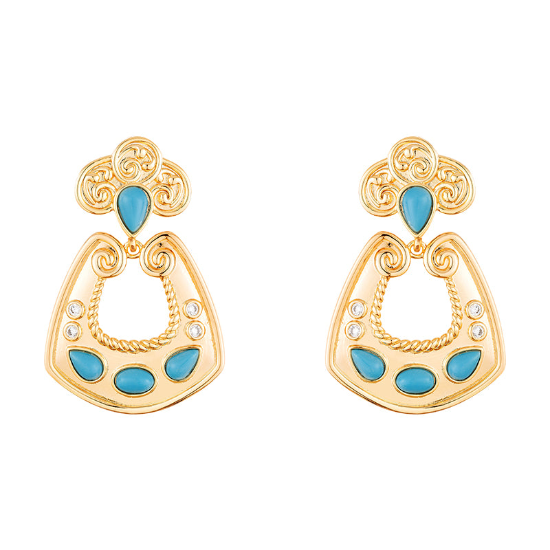 Com banho de ouro 18k e pedra turquesa, este brinco resgata o poder das musas inspiradoras. Ornamentadas, imponentes e cheias de presença, celebram a mulher que inspira pelo exemplo.