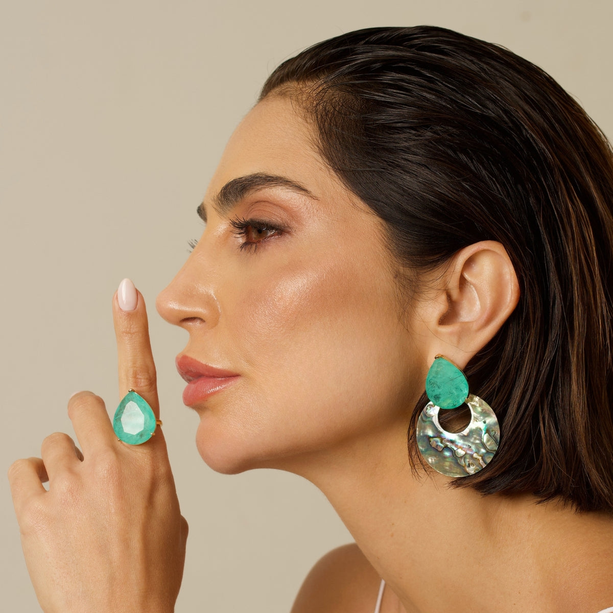 Em forma de gota, o Brinco Presença Abalone une reflexos naturais e brilho intenso em uma composição elegante, criando um efeito luminoso que destaca o rosto com sofisticação.