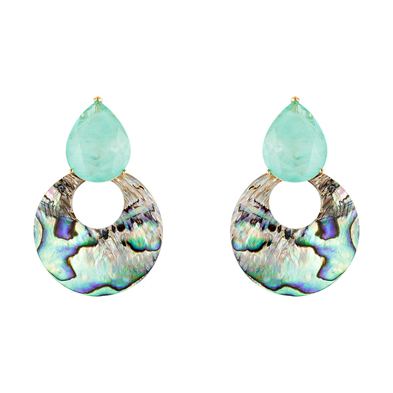 Brinco com designer de gota, fusion turmalina e abalone, em banho de ouro 18k.