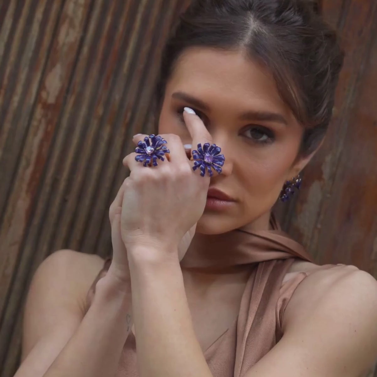 Esmaltação tipo lacquer em tom violeta e pétalas delicadas se abrem em movimento. Este brinco é flor em atitude: intensidade de cor, leveza de forma e força de expressão.