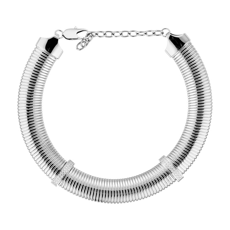 A vibração do Tubogas unida ao brilho dos cristais cria um colar moderno e luminoso, que destaca o colo com elegância marcante e um toque de sofisticação contínua.