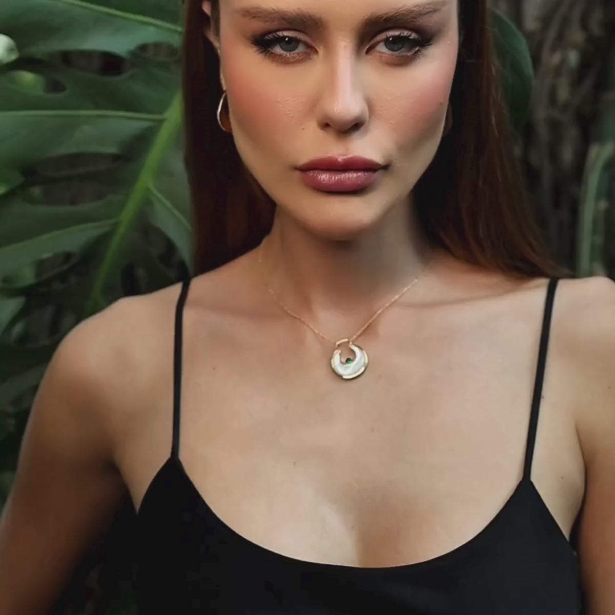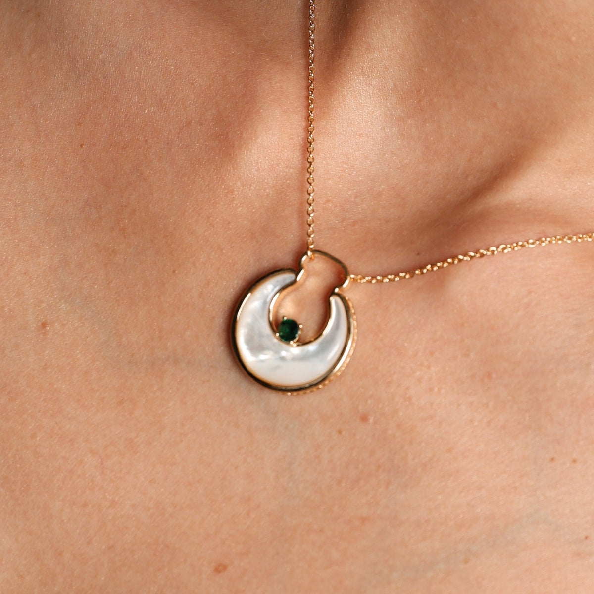 No silêncio quente da noite tropical, a lua repousa sobre o mar. Luar é feito de madrepérola e sonho, com um toque esmeralda que reflete mistério e calma. Um colar que fala com a alma: entre luz, sombra e encantamento.