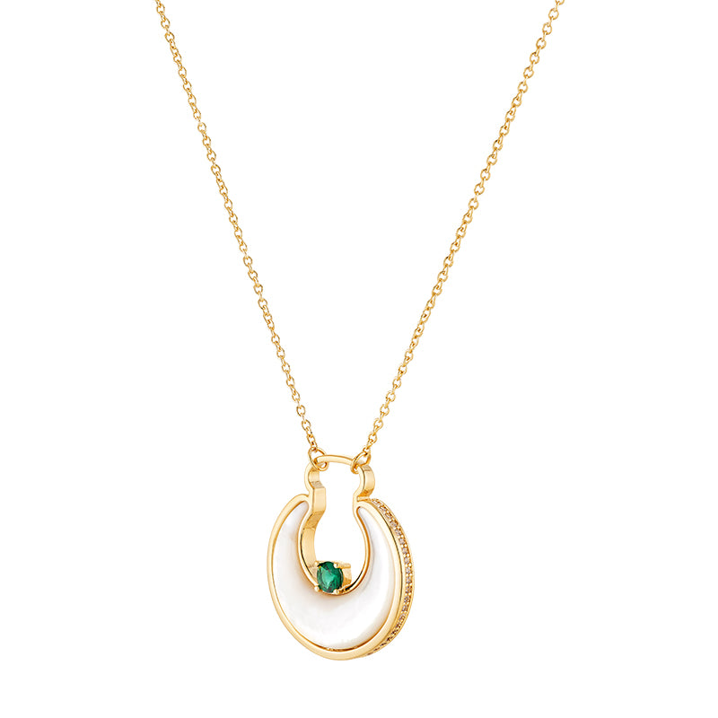 Colar em metal com madrepérola, zircônias nas cores cristal e esmeralda, com banho de ouro 18k.