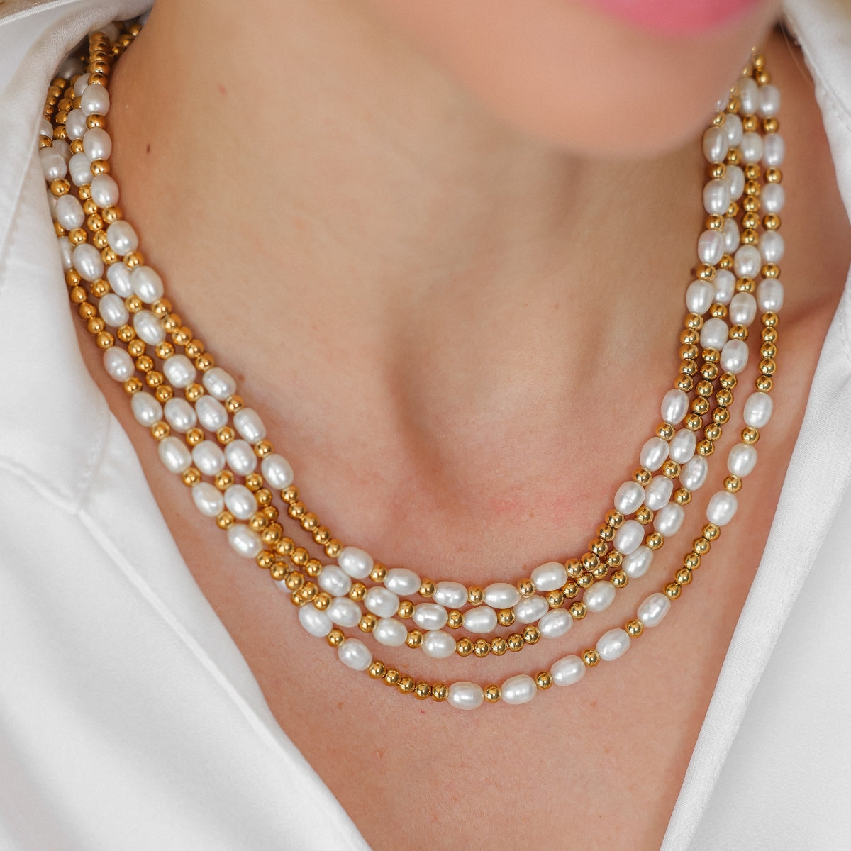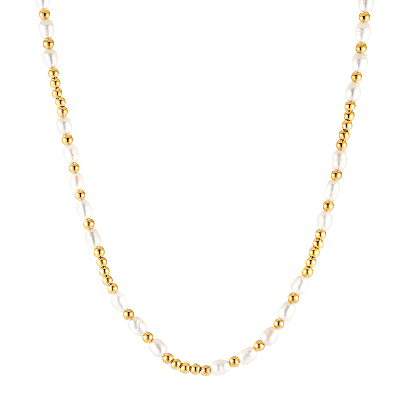 Colar composto por pérolas de água doce, e bolinhas no banho de ouro 18k.