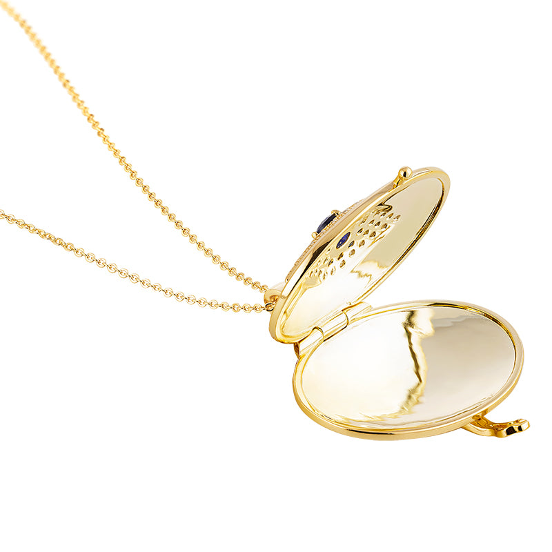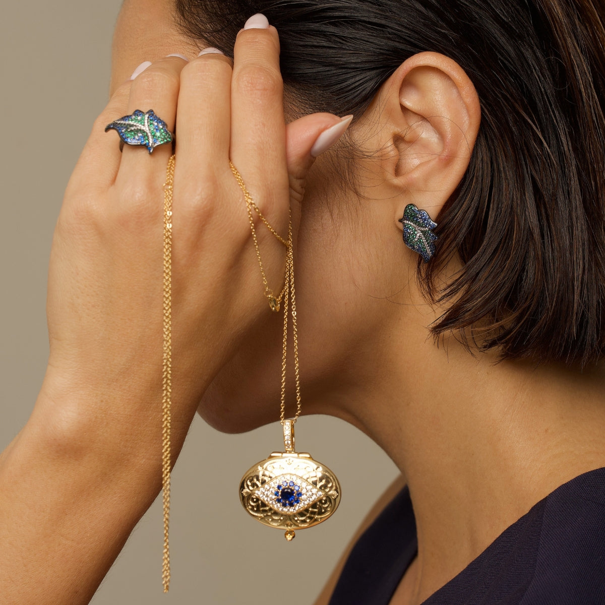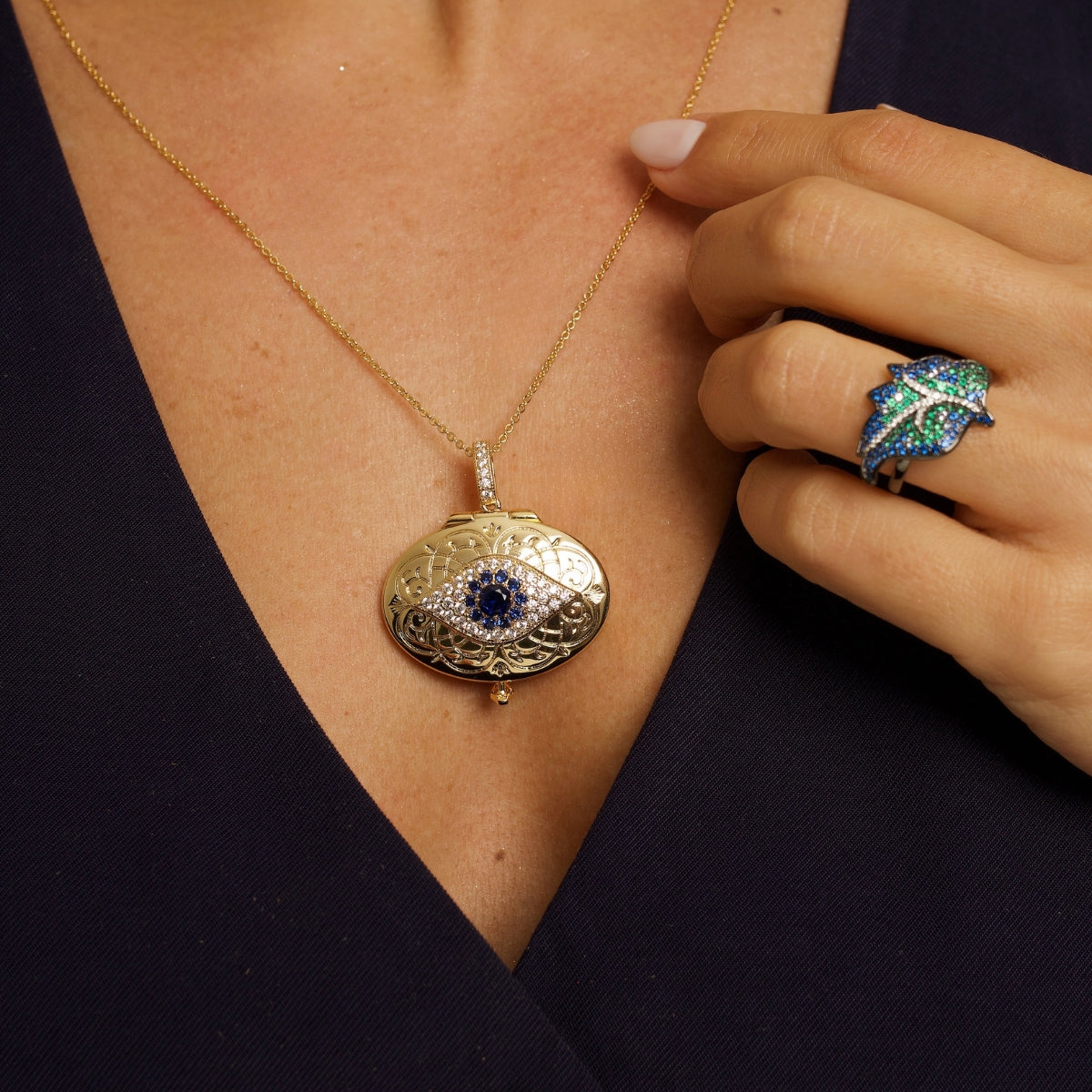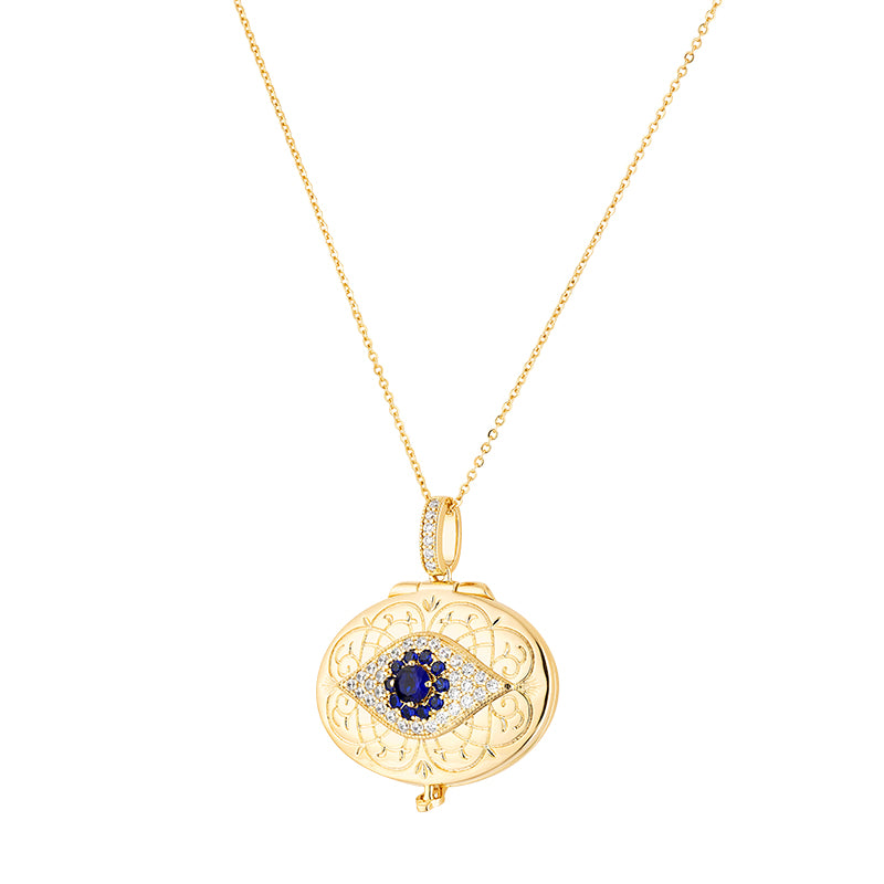 Colar relicário com designer de olho grego, com zircônia nas cores cristal e topázio azul, em banho de ouro 18k.