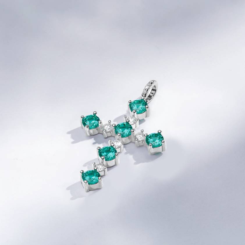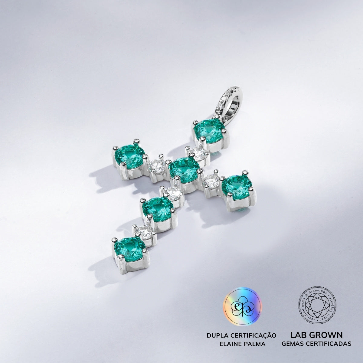 Pingente com Turmalina Paraíba Lab Grown, lapidação de brilhante e cravação em Moissanite, prata 925 com banho de ródio.